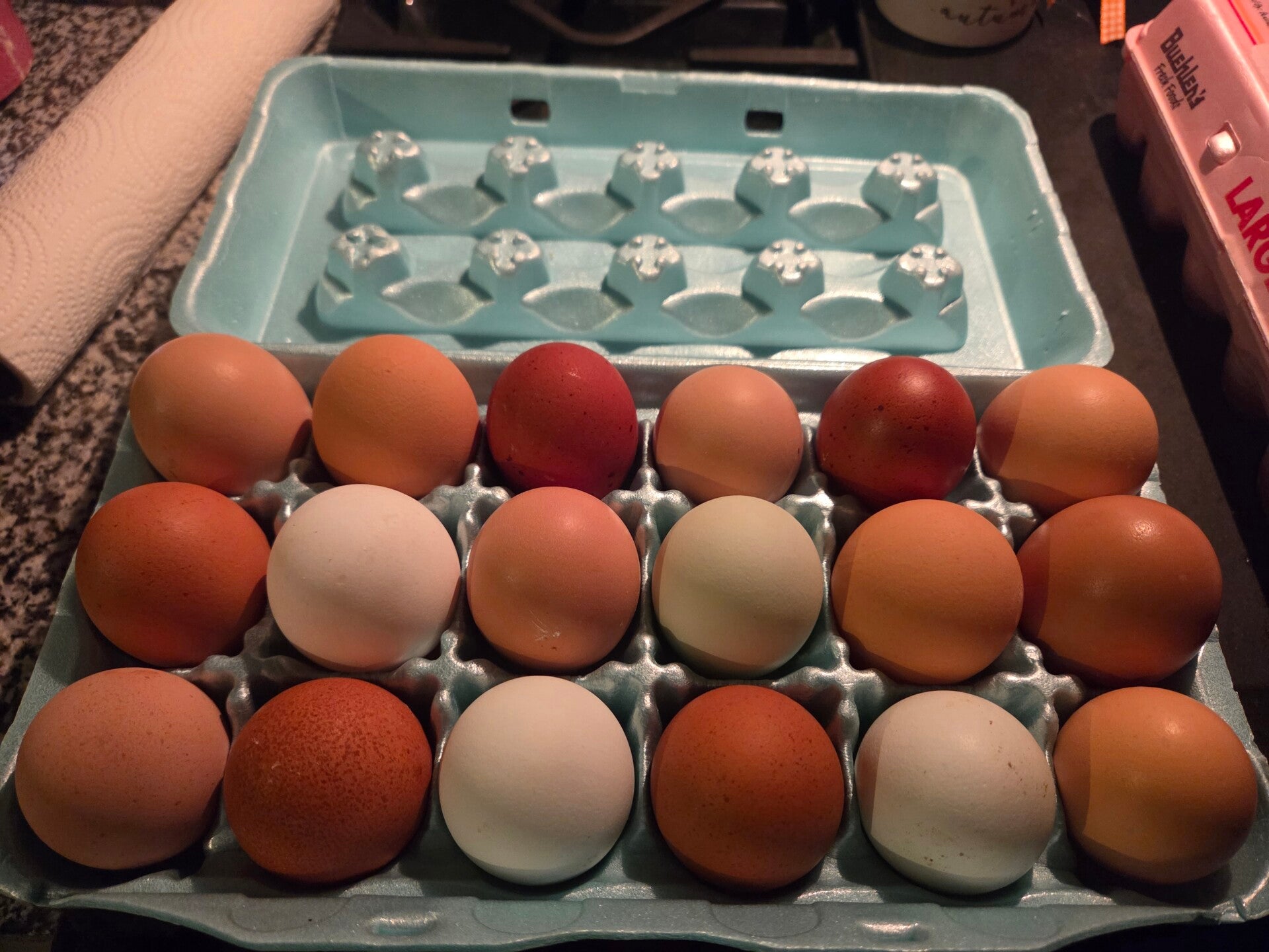 I offer pasture raised eating eggs. My chickens are fed a balanced diet. Along with fresh produce and treats. I spoil my babies. They lay rainbow colored eggs.